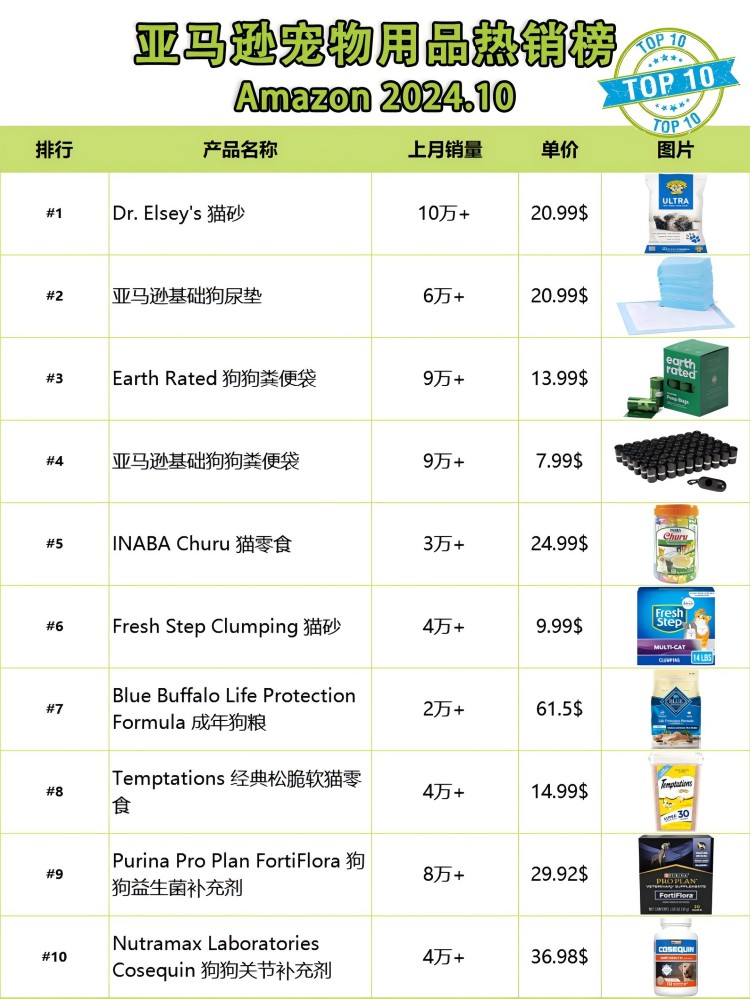 亚马逊销售排行榜(Best Seler)是基于销售而定的最受欢迎商品。 经常更新。2024年10月数据没有大变化,宠物消耗品遥遥领先!#1、Dr. Elsey's 猫砂上月销量:10万+#2、亚马···